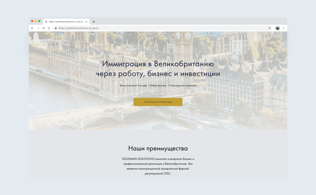 Компания занимается помощью в релокации в Великобританию, делают это давно и хорошо. Долгое время работали на личных лидах владельца, а в 2019 году стали совсем взрослыми и пришли к планомерному маркетингу. Система продвижения была выстроена отлично, со многих каналов вели потенциальных клиентов именно на сайт. В последние 2 года конверсия начала падать в геометрической прогрессии. Проблема оказалась именно в сайте. Мы полностью пересобрали логику (ушли от длинной колбасы лендинга, развели услуги по разным страницам и подробно расписали каждую из них). Затем упростили визуал страниц и наладили систему регулярного обновления контента. Как итог —конверсия выросла аж на 40%, а все потому, что пользователи просто перестали путаться в поисках заветной кнопки «купить». Звучит как волшебная пилюля от всех болезней, но по сути это именно она и есть!