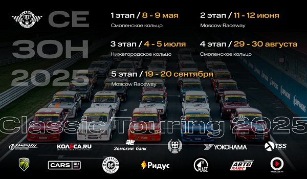 Международная серия кольцевых гонок на исторических автомобилях Classic Touring готовится к старту своего шестого сезона! В сезоне-2025 участников и команды ждет пять этапов Серии CT на автодромах в Смоленске, Москве и Нижнем Новгороде, которые вновь объединят всех влюбленных в автоклассику: 1 этап 8-9 мая «Смоленское кольцо» (Смоленская область) 2 этап 11-12 июня Moscow Raceway (Московская область) 3 этап 4-5 июля «Нижегородское кольцо» (Нижегородская область) 4 этап 29-30 августа «Смоленское кольцо» (Смоленская область) 5 этап 19-20 сентября Moscow Raceway (Московская область) Открытие нового сезона традиционно запланировано на 9 мая и будет приурочено к празднованию Дня Победы! Первые заезды Серии CT-2025 встретит трасса «Смоленское кольцо». А гранд-финал, который решит судьбу чемпионов, пройдет в сентябре на одном из лучших автодромов страны — Moscow Raceway. Гонки Classic Touring проходят при поддержке Российской Автомобильной Федерации. В рамках Серии классы А2-1300, А2/1-1600,