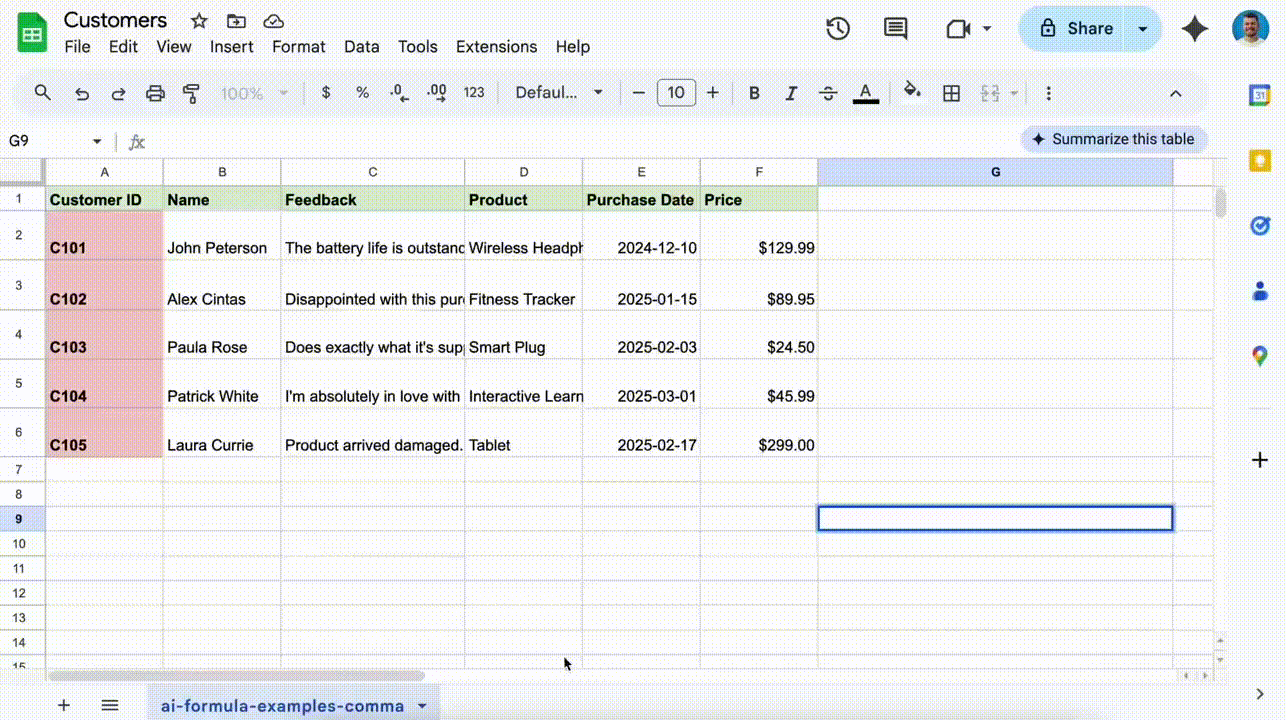 Объяснение информации: =AI("Перескажи отзыв клиента в паре предложений", A2:D2)