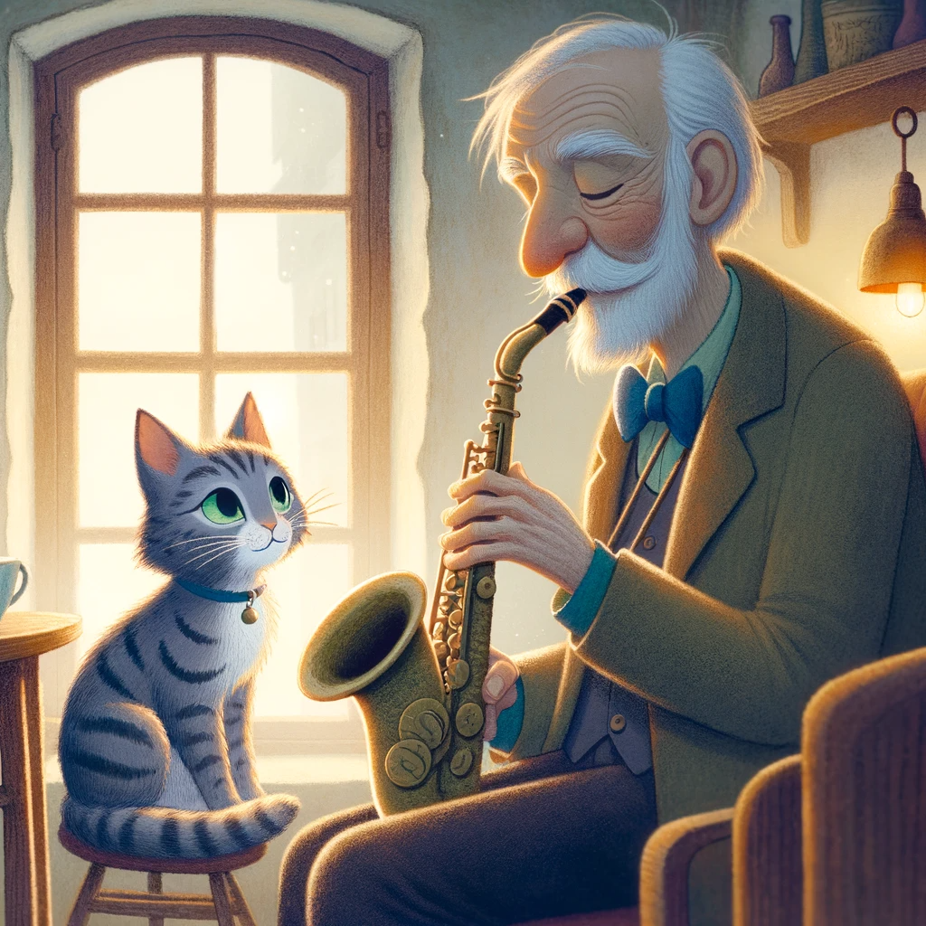 Однажды утром, когда первые лучи солнца только начали пробиваться сквозь облака, Мурзик услышал чарующие звуки саксофона. Эта музыка звучала так нежно и волнующе, что Мурзик не мог остаться равнодушным. Он решил найти источник этой волшебной мелодии. Пройдя через узкие улочки и переулки своего города, Мурзик оказался у маленького уютного кафе, откуда и доносилась музыка. Там, за столиком, сидел старик с саксофоном. Каждое движение его пальцев по клавишам будто рассказывало отдельную историю. Мурзик подошел поближе, заинтригованный. Старик заметил кота и улыбнулся ему. "Привет, мой маленький друг. Меня зовут Луи, а это мой старый друг - саксофон," - представился он. Мурзик урчал в ответ и устроился поближе, чтобы лучше слушать музыку. Луи рассказал ему историю о том, как в молодости он был известным саксофонистом, но со временем забыл о своем увлечении из-за многих забот и проблем. "Теперь я играю лишь для себя и для тех, кто готов слушать," - сказал Луи, продолжая играть. Мурзик был оч