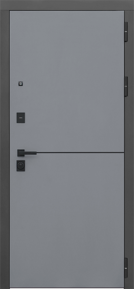 Петли: 3 петли с подшипником. Внешняя отделка: наружный лист металла 1,5 мм, экошпонированная панель МДФ 10 мм (цвет «альянс TF 40 IE-X-89U графит»), декоративный молдинг 10 мм (цвет «черный»), наличник гладкий МДФ 80 мм (цвет «черный кварц»).