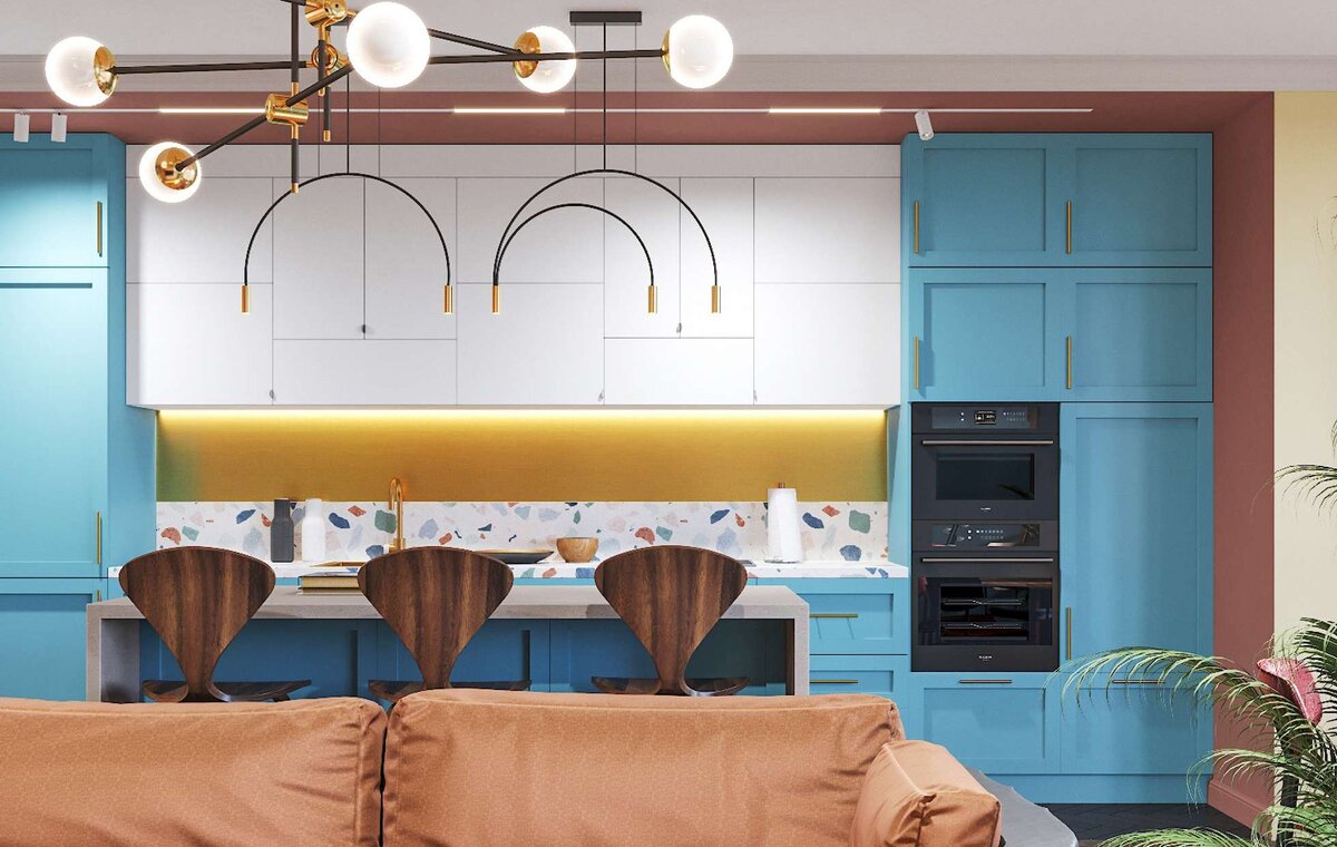 Использовали много ярких цветов, нестандартную отделку, чтобы создать стильный и нескучный интерьер Место: Санкт-Петербург Метраж: 133 кв. м Комнаты: 5 Cанузлы: 2 Высота потолков: 2,75 м Бюджет: 8,6 млн рублей Дизайн: VizDiz Вкратце Дизайнер Илона Ореховская оформила просторную квартиру для семьи с одним ребенком. Заказчики были готовы к интересным цветовым сочетаниям и дизайнерским приемам. Фишкой интерьера стало использование геометрических линий и разнообразных методов художественного оформления. Автор проекта применила нестандартный подход к дизайну, цветовой палитре и миксу фактур. В таком интерьере точно не будет скучно. Подробности Квартиру разделили на функциональные зоны. Просторная кухня-гостиная с барной стойкой, обеденным столом и диваном с ТВ — место, где собираются вся семья и гости. Две соседние комнаты обустроили под детские (заказчики планируют второго ребенка). В противоположной части квартиры находится спальня родителей с рабочим кабинетом. За хранение отвечает больш