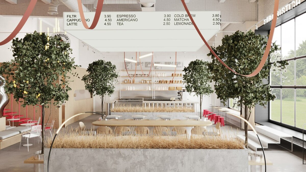 Кофейня оформлена в светлых и уютных пастельных тонах, с яркими акцентами. Заметным элементом является круглый стол, предназначенный для рабочих и деловых встреч. Центральная часть стола украшена скульптурой, выполненной из “жидкого” и перетекающего металла. Этот элемент вносит нотку хай-тека в интерьер. Общий вид помещения дополнен декоративными элементами - деревьями и боксами с колосьями, которые придают натуральности интерьеру.