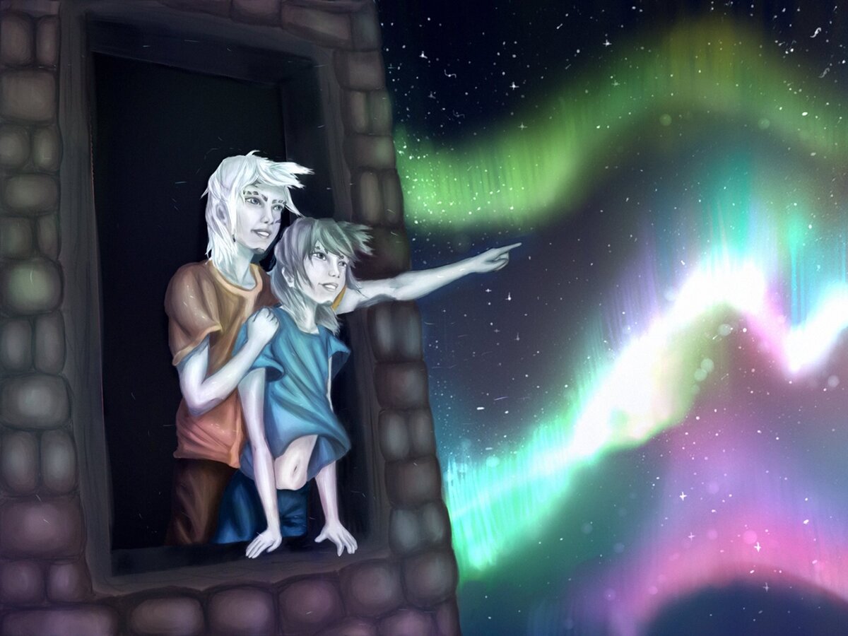 Рейна прищурилась и устремила взгляд вдаль, туда, где снежные вершины касались облаков. Внезапно ей показалось, что над горами что-то блеснуло. Девочка уперлась ладонями в раму и вгляделась в поблескивающую точку в небе. Вдруг искра засверкала ярче, и в мгновение ока по горизонту разлились волны света, будто из берегов вышел волшебный небесный источник. Порывы ветра, свистя в щелях окна, то и дело трепали волосы юных ниесов, свет отражался в восторженных глазах яркими искорками. По каждому камню в стенах заплясали разноцветные искорки. Темно-зеленые ели теперь казались совсем черными. Они чуть заметно покачивали остроконечными вершинами, словно пытались дотянуться до света, разукрасившего небо всеми известными оттенками. Рейна почувствовала, как у нее перехватило дыхание.