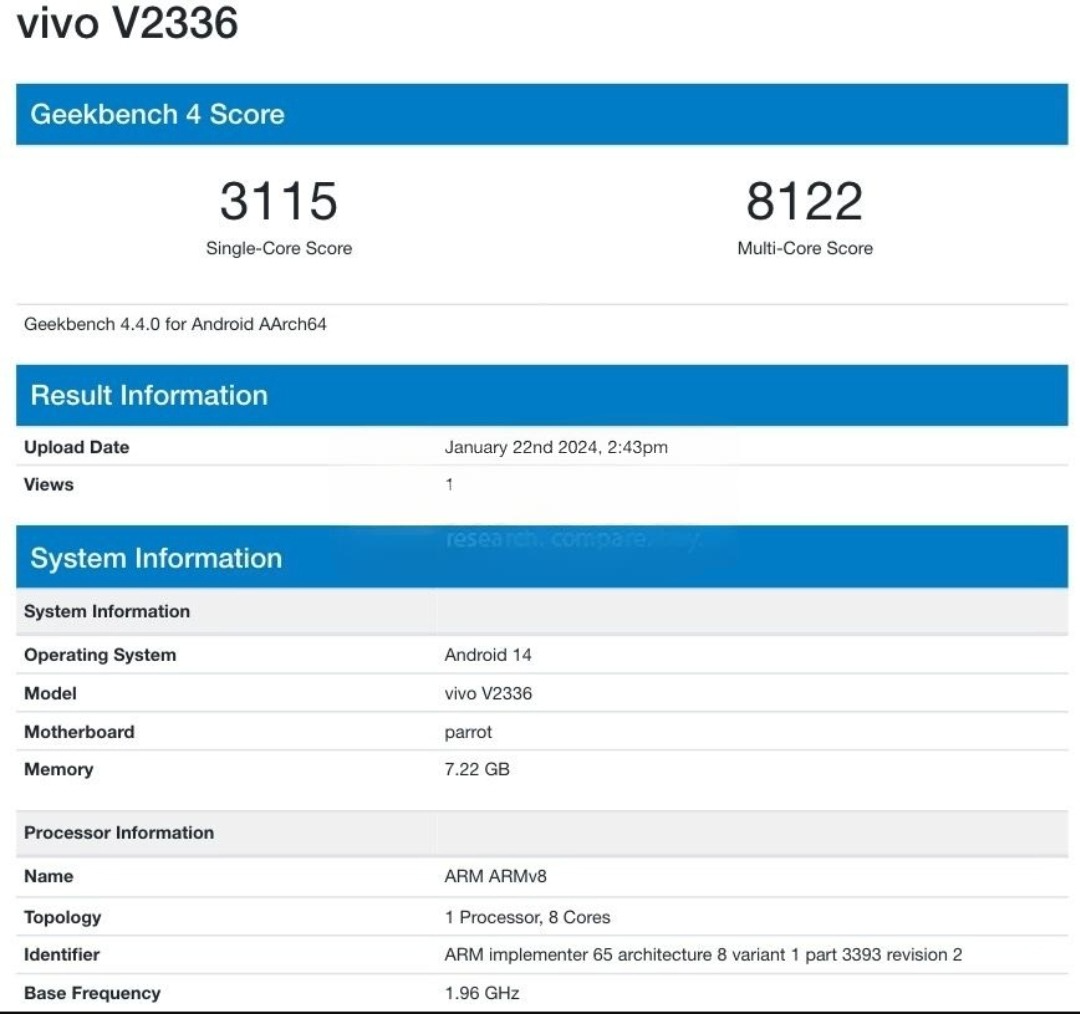 Сообщается, что на данный момент находится в процессе разработки новая модель Vivo Y200e. Недавно она была замечена в сертификации Bluetooth SIG, а сегодня также появилась информация о ней на популярной платформе сравнительного анализа GeekBench. Несмотря на то, что в октябре 2023 года Vivo представила модель Y200 на индийском рынке, данное устройство так и не появилось больше нигде. Тем не менее, вскоре будет выпущена новая модель из серии Y200. Как упоминалось ранее, в базе данных GeekBench обнаружено устройство Vivo Y200e с номером модели V2336, который совпадает с номером в списке сертификации Bluetooth SIG. Из этого можно сделать вывод, что запуск новой модели может быть близким. По данным листинга, Vivo Y200e будет поддерживать сети 5G благодаря процессору Qualcomm Snapdragon 4 Gen 2 SoC и графическому процессору Adreno 613. В устройстве будет установлено 8 ГБ оперативной памяти, а в качестве пользовательского интерфейса используется Funtouch OS на базе ОС Android 14. Тестировани