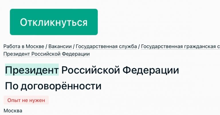 Вакансия на должность президента Российской Федерации появилась на сайте Superjob. Кандидату предлагают «белую» зарплату и личный самолет, полное содержание за счет государства для него и членов семьи. Глобально обязанность, в общем-то, одна — «эффективно управлять страной с населением 150 миллионов человек», как сказано в объявлении. Но еще есть список из 20 пунктов, среди которых назначение выборов Госдумы, подписание законов и их внесение, решение вопросов гражданства и т. п. Есть даже пункт о реализации права помилования. Из требований к кандидату: возраст от 35 лет, активная жизненная позиция и патриотизм, «опыт проживания в РФ не менее 25 лет». Еще кандидат должен владеть хотя бы одним европейским языком и быть готовым к постоянным командировкам. Объявление о поиске президента разместили на сайте с вакансиями явно не потому, что текущий работник собирается уволиться. В компании Superjob заявили, что хотели этим объявлением привлечь внимание к выборам. «Этой активностью мы хотим н