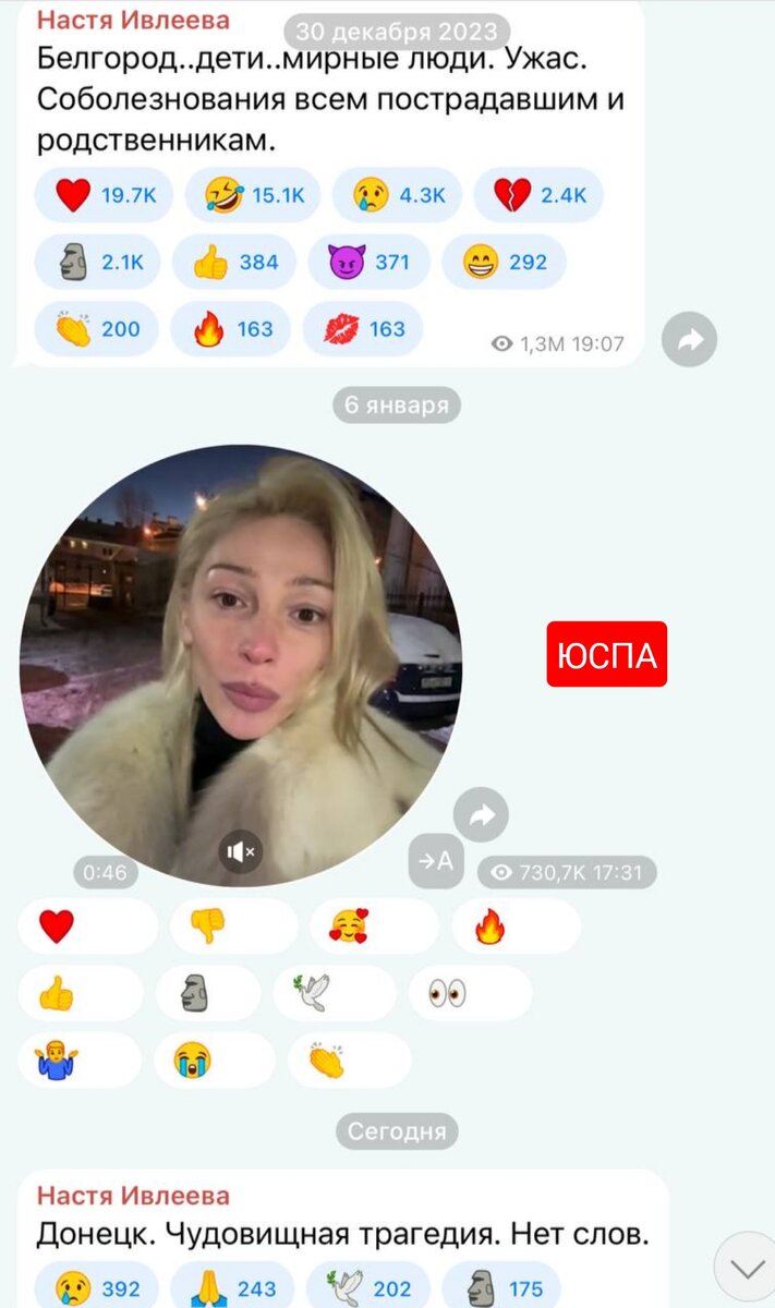 Судя по всему, Анастасия Ивлеева после "голой вечеринки" приняла правила общественной игры и теперь, вместо критики СВО, выражает соболезнования жертвам украинских терактов. ЮСПА