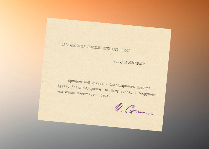 В личном фонде скрипача Давида Ойстраха в Музее музыки хранится пожелтевший от времени листок бумаги с машинописным текстом. Адресованная выдающемуся музыканту записка гласит: «Примите мой привет и благодарность Красной Армии, Давид Фёдорович, за Вашу заботу о Вооружённых Силах Советского Союза». Подпись фиолетовыми чернилами принадлежит Иосифу Сталину. Содержание записки ясно указывает на то, что она является ответом на письмо Ойстраха, — к сожалению, в фондах Музея отсутствующее. Однако в газете «Литература и искусство» от 3 апреля 1943 года были опубликованы оба документа — и записка Сталина, и письмо Ойстраха. В нём говорилось: «Дорогой Иосиф Виссарионович! Я глубоко взволнован присуждением мне премии Вашего имени. Радостно сознание того, что служение любимому искусству, отражающееся в моей концертной деятельности, получило столь высокую оценку Партии и правительства. Я вношу полученную премию 100 000 рублей в особый фонд Главного Командования для скорейшего разгрома вражеских полч
