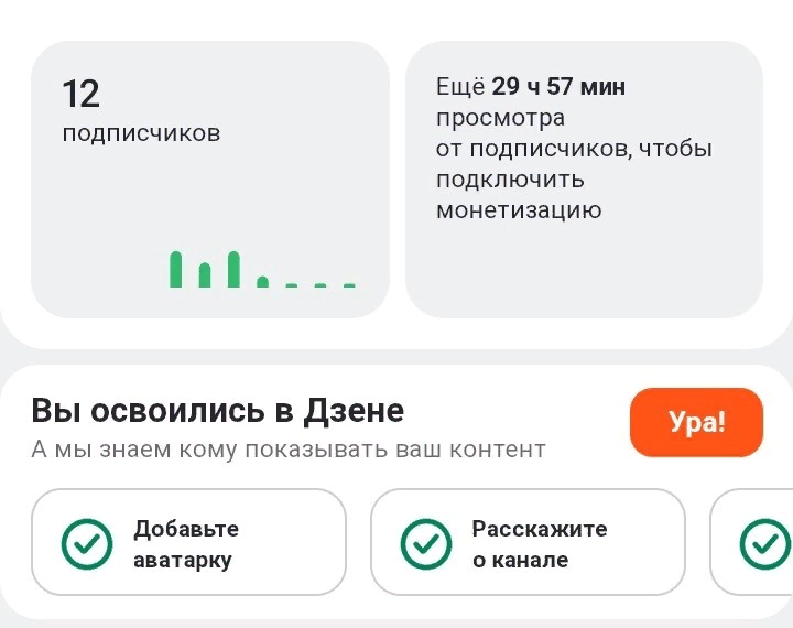Всем привет! Вы на канале Попурри о жизни и любви и у нас реалити: открываем новый канал с нуля до монетизации. По итогам недели: у меня есть оформленный канал, 7 публикаций на нём, 12 подписчиков. До монетизации осталось ещё 29 часов 57 минут внимательного прочтения от подписчиков. Дзен не сильно радует показами, только один пост набирает регулярно просмотры и немножечко ещё один. Остальные сначала получают просмотры, а потом теряют их, и так уже повторилось несколько раз. В планах на следующую неделю: выпустить не менее 5 новых постов, привлечь ещё подписчиков, а также анализировать статистику - что лучше заходит и в какое время. Продолжение следует... ,
