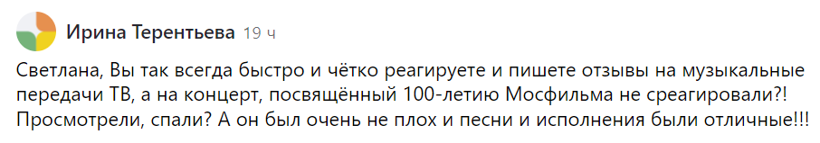 А я хочу поблагодарить всех, кто готовил программу юбилейного вечера, посвящённого 100-летию Мосфильма. Мне скучно не было. Простите, коллеги, кто думает иначе.