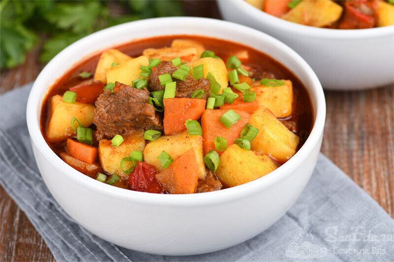 Мне очень нравится это блюдо. Оно легкое в приготовлении, для него требуются простые продукты, а получается очень сытным, вкусным и ароматным. Венгерский гуляш похож на нашу тушеную картошку, только с большим количеством бульона, или очень густой суп. Вкус отличается за счет добавления специй и других овощей.