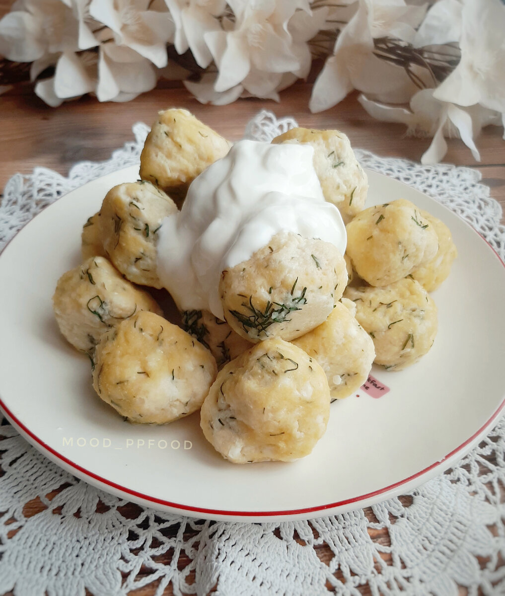 ⭐КБЖУ на 100 г.: 153.8 ккал 15/6/9.4 Выход: 406 г. ⭐Ингредиенты: Творог 5% - 180 г. Яйцо куриное - 1 шт. Мука нутовая - 70 г., можно заменить на рисовую. Сыр лёгкий - 40 г. Зелень свежая, у меня укроп. Соль по вкусу. ⭐Приготовление: 1️⃣ В миске соединяем 180 г. творога, одно яйцо, 70 г. муки и чуточку соли. Всё перемешиваем. 2️⃣ Добавляем натертый сыр и измельчённую зелень, снова перемешиваем. 3️⃣ Из полученной массы лепим кругляши. 4️⃣ Наливаем в кастрюльку воды, доводим до кипения и кидаем в неё наши шарики. 5️⃣ После всплытия варим ещё 2-3 минуты и готово. Вынимаем из воды шумовкой и кушаем сметанкой😋 Приятного аппетита ❤