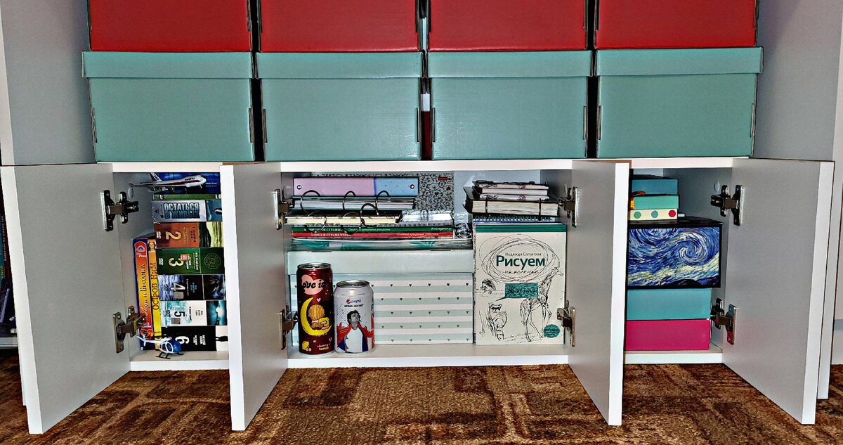 В крайнем справа отделении — в декоративных коробках «всякое-разное», в два ряда.