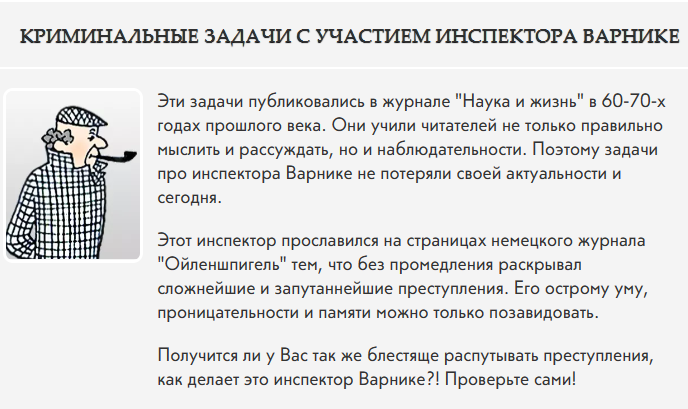 Доброго времени суток и наилучшие пожелания любителям логических задач и детективных головоломок! Начинаем конкурс детективов , который продлится столько времени, на сколько у вас хватит желания и терпения. Скажу прямо : я не гений и даже не похож на него, загадки я беру из давным-давно опубликованных и надеюсь, успешно забытых журналов , которые когда-то тоже не гнушались перепечатывать их друг у друга, и даже не скрывали этого. Не скрываю и я : Итак, попробуем решить первую загадку из этой серии. КТО ЖЕ ПРЕСТУПНИК? - Исчезло ровно 2 056 марок. Я дважды пересчитывал сумму. - Кого вы подозреваете в преступлении? - Откровенно говоря, не знаю, - ответил кассир. - Расскажите, как было дело. - Это произошло при следующих обстоятельствах. Я пересчитывал деньги. Вдруг в комнате стало темно. Потухла лампа. Я поставил стул, вскарабкался на него и схватился за лампу. От сильного ожога я пошатнулся и свалился на пол. Некоторое время я был без сознания, а очнувшись увидел весь этот бес
