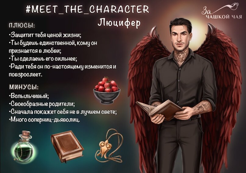 Ссылка на канал Алисы https://t.me/aliccachtg Что носит с собой: ⁃ Книга. Любит классику, но редко читает произведения смертных. ⁃ Яд. Еще с детства брал склянки из арсенала Сатаны, но так ни разу ими не воспользовался, в конечном итоге предпочитая грубую силу. ⁃ Клубника. Иногда берет с собой, если в дороге захочется перекусить. ⁃ Амулет матери Плюсы отношений: — Защитит тебя ценой жизни — Ты будешь единственной, кому он признается в любви — Ты сделаешь его сильнее — Ради тебя он по-настоящему изменится и повзрослеет Минусы отношений: — Вспыльчивый — Своеобразные родители. Отец вряд ли примет тебя в качестве невестки — Прежде чем полюбить тебя, проявит себя не в лучшем свете — Тебя будут ненавидеть влюбленные в него дьяволицы English ver: Items:
