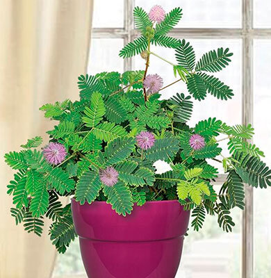 Мимоза стыдливая — вечнозеленый декоративный кустарник родом из субтропиков Южной Америки. Своё распространение мимоза стыдливая получила из-за причудливого свойства реагировать на любое прикосновение, даже лёгкого ветра. Она тотчас начинает сворачивать свои листочки. Создаётся впечатление, что она двигается. С целью сохранения декоративных свойств чаще выращивается как однолетняя культура. Не следует часто трогать листочки. Несмотря на то, что мимоза, на первый взгляд, кажется такой нежной, уход за ней, на самом деле, несложен. Она любит тепло, температура воздуха, начиная с ранней весны и до поздней осени, должна быть в пределах 20-24 °C. Зимой следует понизить температуру до 16-18 °C. Любит яркий свет, даже прямые солнечные лучи.В весенней и летний период полив должен быть обильным и регулярным. Зимой достаточно поддерживать грунт в чуть влажном состоянии. Единственная ее особенность, — она совершенно не выносит табачного дыма, сразу сбрасывает листья. Размножается семенами.Семена