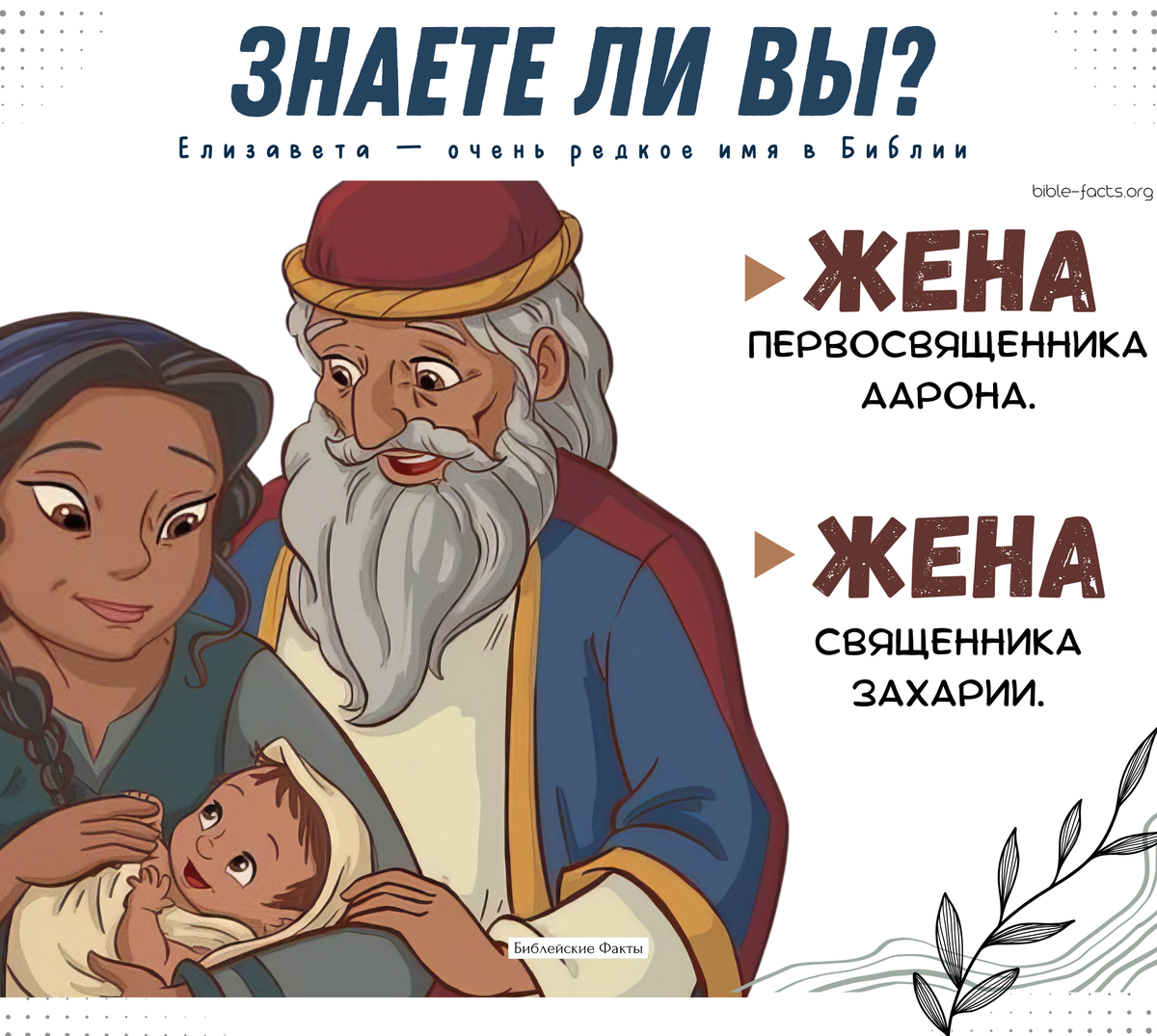 Елизавета — очень редкое имя в Библии: только одна женщина в Ветхом Завете и только одна в Новом названы этим именем. Интересно то, что женщины с именем Елизавета и в Ветхом, и в Новом Заветах принадлежали мужьям-священникам.