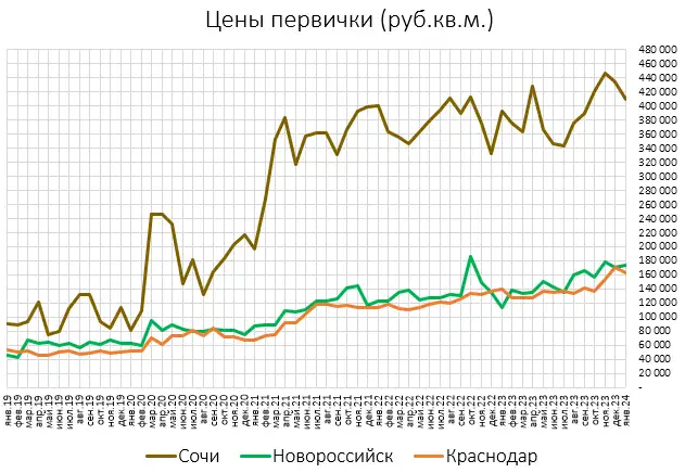 Со времени последнего обзора южных квартир прошло полтора месяца. Давайте посмотрим, что там изменилось. По состоянию на сегодня, данные Домклик по основным городам Краснодарского края выглядят так: Напоминаю, что сочинские новостройки - это не дешевые бетонные курятники для замороженного пролетариата, а позолоченные дворцы для невыездного правящего класса. С лета 2021 года чиновники разрешают строить там только многоквартирные дома для своих. Отсюда - такая дикая разница между ценами новостроек в Сочи и в том же Новороссийске. Рублевые цены вторички в Сочи и Краснодаре уже два года ползут вниз. Гелик - в боковике. Новороссийск и Анапа слегка подрастают на климатических беженцах со всей России.