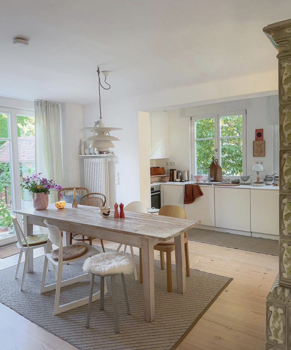 Сегодня я наткнулся на чудесный семейный дом Стефани Фридрих и понял, что должн поделиться им с вами! Стефани живет со своим мужем и двумя мальчиками на берегу Боденского озера в Германии. Они создали прекрасную, уютную базу для отдыха. Светлые и просторные стены, в основном белые, местами отделанные обоями с цветочным рисунком. Но очарование заключается в уникальном сочетании мебели и личных вещей, разбросанных по комнатам. Если вы живёте со скошенными потолками и неудобными углами в своем доме, вам, вероятно, понравится главная спальня и ванные комнаты, которые максимально преобладают пространств. В общем, идеальный домашний тур, которым можно завершить неделю! Минималистичная белая кухня на фоне белых стен почти сливается, но разного рода пятна и объекты разбавляют скуку. Например контрастный ковёр под обеденной группой. В моей жизни уже был опыт с ковром под обеденным столом. Это в каком-то смысле удобно. Например, крошки упавшие вниз со стола практически не уходят за пределы ков