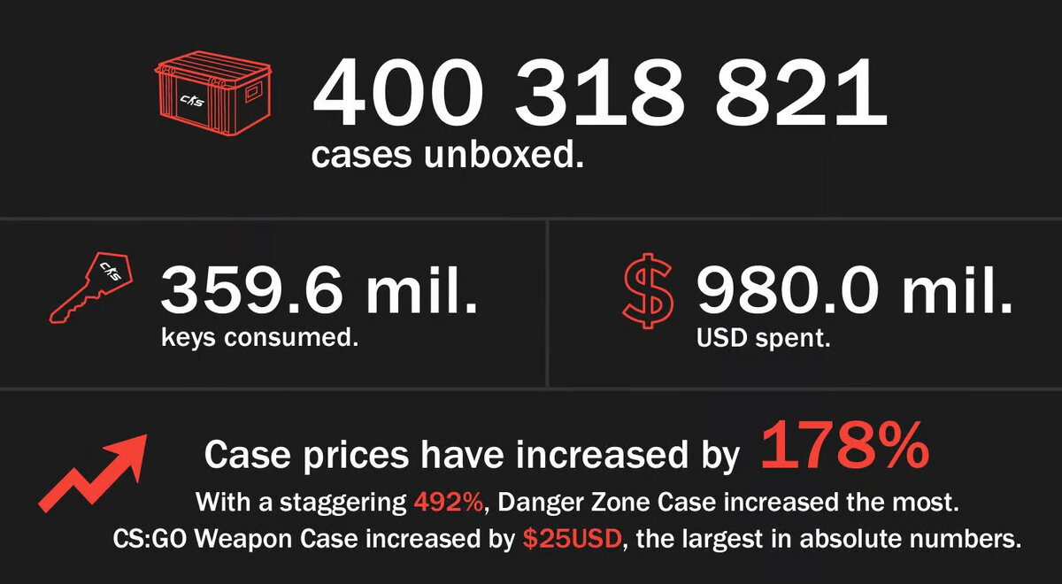 Как утверждается, в 2023 году Valve получила около $1 млрд от вскрытия кейсов со скинами в Counter-Strike 2. Об этом свидетельствуют отчеты сайтов, отслеживающих количество вскрытых кейсов и ценовые тенденции в игре. Долгожданный релиз CS2 состоялся 27 сентября 2023 года. И главный шутер Valve вступил в новую эру Counter-Strike. С тех пор игра неизменно возглавляет чарты Steam и является самой популярной на платформе. Всплеск популярности также привлек в игру новую волну игроков, создателей контента и стримеров, решивших испытать удачу с покупкой и вскрытием скин-кейсов. Некоторые скины и кейсы продаются за тысячи долларов, поэтому они стали одними из самых желанных предметов. К примеру, недавно был обнаружен Blue Gem AK-47, стоимостью около $1 млн. Согласно годовому отчету CS2 Case Tracker, оценочная прибыль Valve от кейсов CS2 в прошлом году составила $980 млн. Поражают и другие цифры в отчетах: вскрыто более 400 млн кейсов, израсходовано почти 360 млн ключей. Кроме того, как утвержд