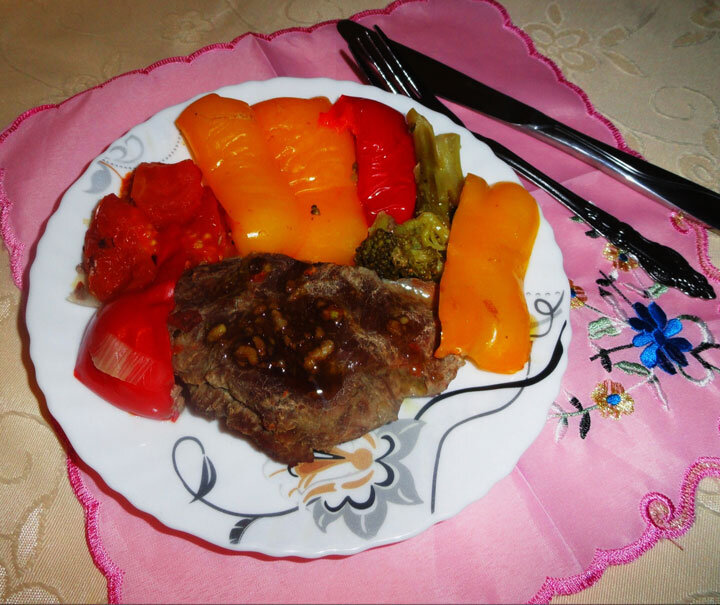 ✓ 3 ст. л. оливкового масла; ✓ 1 ст. л. соевого соуса; ✓ Молотый черный перец; ✓ Зубчик чеснока. Мясо зачищаем от жилок и нарезаем на 4 крупных куска, слегка отбиваем. Чеснок пропускаем через пресс. Мясо солим, перчим (можно добавить любимые специи), натираем чесноком. маринуем в соусе 30 минут. Лук нарезаем кольцами, сладкий перец разрезаем на 4 части. Баклажан очищаем и нарезаем крупно. В ёмкость для запекания выкладываем овощи слоями, солим. На овощи выкладываем мясо, добавляем 100 мл воды,закрываем крышкой и ставим в разогретую духовку (180 градусов) на 1,5 часа. КБЖУ на 100 г – 142/11,1/9,2/3,3. От наших друзей: Сергей Воронов, гитарист, создатель группы CrossroadZ, на Радио Медиаметрикс Больше общения и рецептов - в группе "Рецепты для диабетиков" в ВКонтакте! Рецепт на странице Автор рецепта – Наталья Назимова © Почтенный возраст Online и Рецепты для диабе