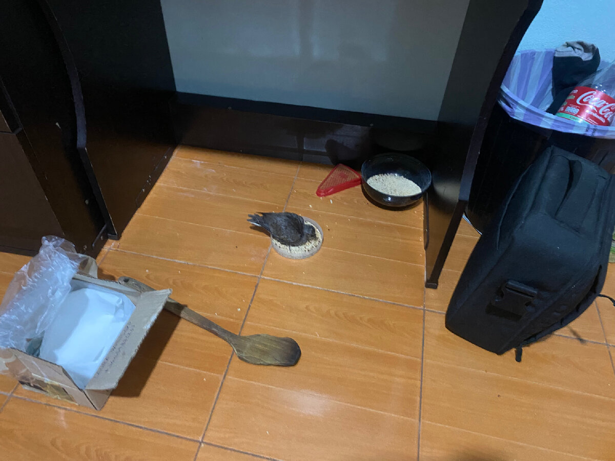 20 января. Суббота. Птенец окреп, но улетать еще не собирается. Только-только пробует перелетать при помощи крыльев с места на место. Ему не нравится ходить пешком, но на большие расстояния летать еще страшно. Крылья Тай использует как помощь, при залезании на меня. Ему нравится кататься на плечах и шее. Говорят, если птица попадает на тебя своими отходами жизнедеятельности, то это к деньгам. Наверное я скоро разбогатею. Хорошо что в доме бесплатная стирка. Интересно наблюдать как он развивается. Еще вчера не умел не есть ни пить, а сегодня я даже убрал у него миску с пшеном. Разобравшись как это работает, Тай набил свой зоб до краев. Потом ходил, выплевывал лишнее. Оставив его дома, прошвырнулся в спортивный зал. Там снова ни кого не было. Иногда, я вижу как приезжают на мотоциклах тайцы, чтобы походить на беговой дорожке за 50 бат. Но в основном, тут пусто. Таиланд захватило ожирение. Технический прогресс, постоянное лето, огромное количество уличной еды, умноженное на мотоб