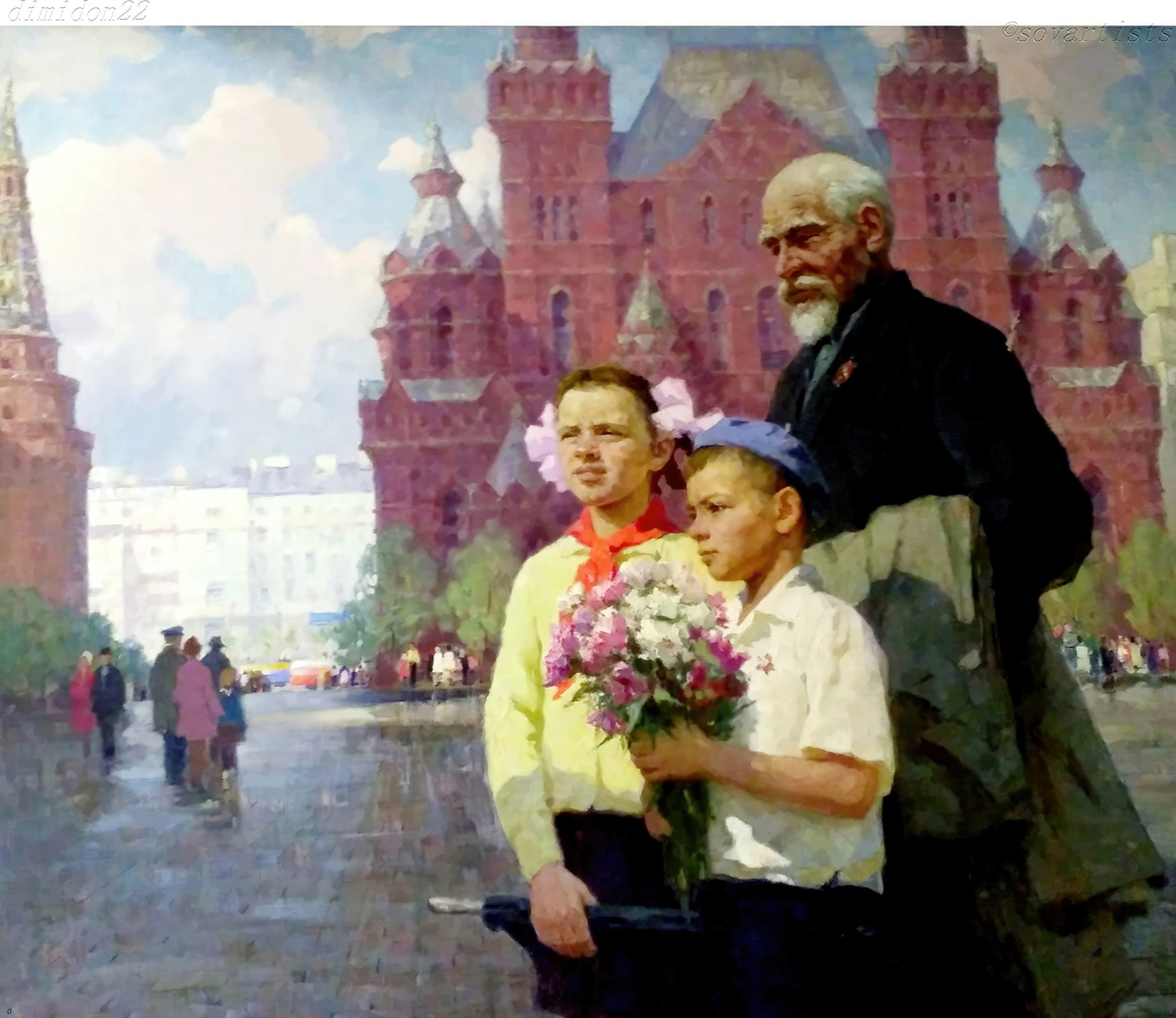Ананьев Юрий Александрович (10.03.1920, с. Огарёвка ныне Саратовской области - 2005, Казань). «У Мавзолея В.И. Ленина». 1969 год. Холст, масло; 150 х 179 см.; (Агинский национальный музей им. Г. Цыбикова Забайкальского края). А вы были в мавзолее, видели Ленина? Я была. Если честно, жуткое зрелище. Смирнов Марк (Маркус) Александрович (20.03.1935, Ленинград - 2003, Комарово). «Утром перед открытием фестиваля. Стадион в Лужниках». 1957 год. Бумага, акварель, гуашь, белила; 347 х 555 мм.; (Научно-исследовательский музей при Российской академии художеств). Как свежо, как здорово написана картина. Прошло столько лет, а праздник продолжается. Лаврецкая Лидия Юрьевна (р. 26.12.1939, Саратов). «Одна». 1980-е гг.; Холст, масло; 79,5 х 108 см.; (Саратовский государственный художественный музей имени А.Н. Радищева). И это соцреализм! Иконы в углу, одиночество в доме, потому что все ее дети ушли на фронт - и не вернулись. Давыдов Борис Иванович (18.07.1936, Павлово ныне Нижегородской области -