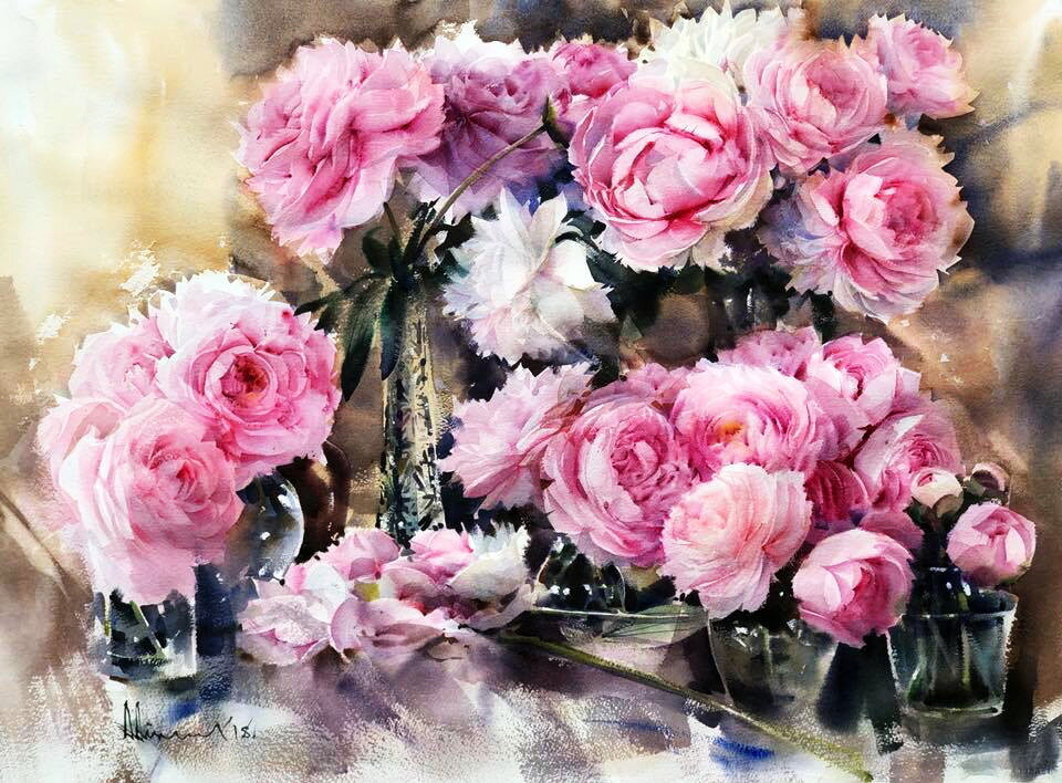 Он шикарно владеет акварелью, а цветы в его исполнении – что-то невероятное. Я узнала, что чаще всего он работает скошенным флейцем. Благодаря этой кисти лепестки, листочки получаются лёгкими, воздушными, живыми.