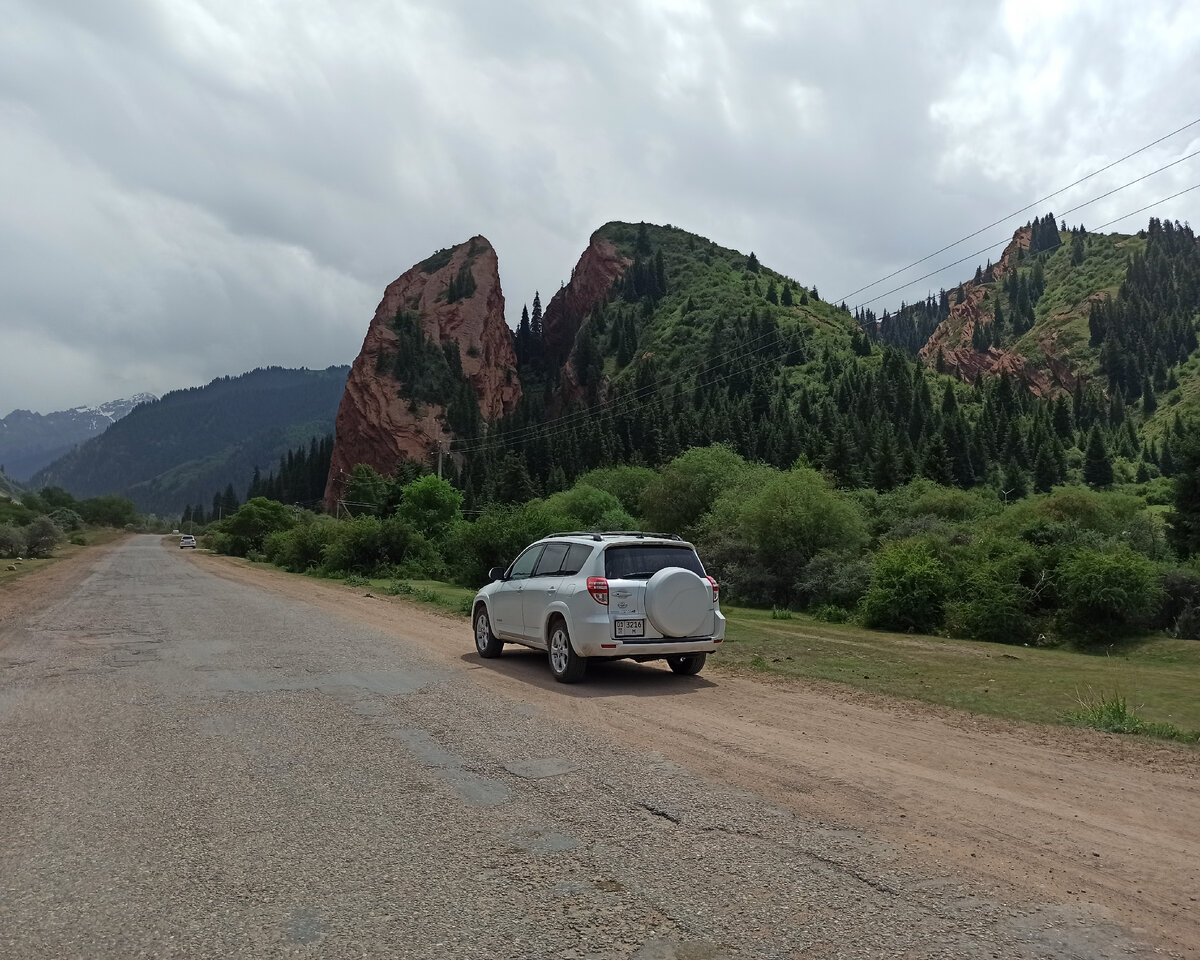 Мы покидаем Каракол и едем в ущелье Джеты-Огуз. У въезда в него стоят огромные рыжие глиняные скалы. Одна в форме сердца (и называется «Разбитое сердце»), а другая в форме башенок (и называется Джеты-Огуз, то есть «Семь быков», хотя башенок больше семи). И, конечно, про них есть свои легенды. Доставайте платочки.