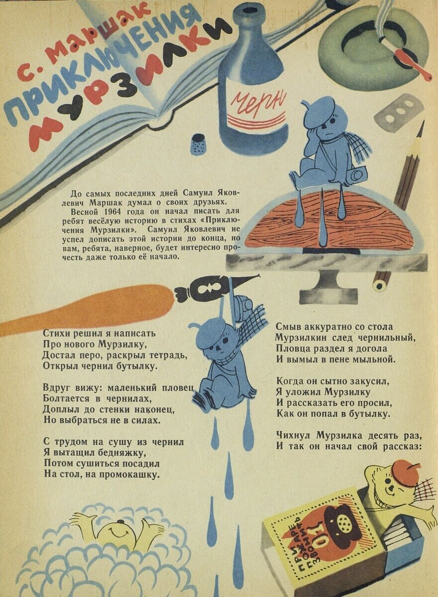 В этой книге Маршак мысленно вернулся во времена своей молодости - судя по черновикам, поэт собирался сделать стихотворный пересказ книги Анны Хвольсон. Крошечный Мурзилка, выловленный из чернильницы, знакомит автора со своими товарищами: