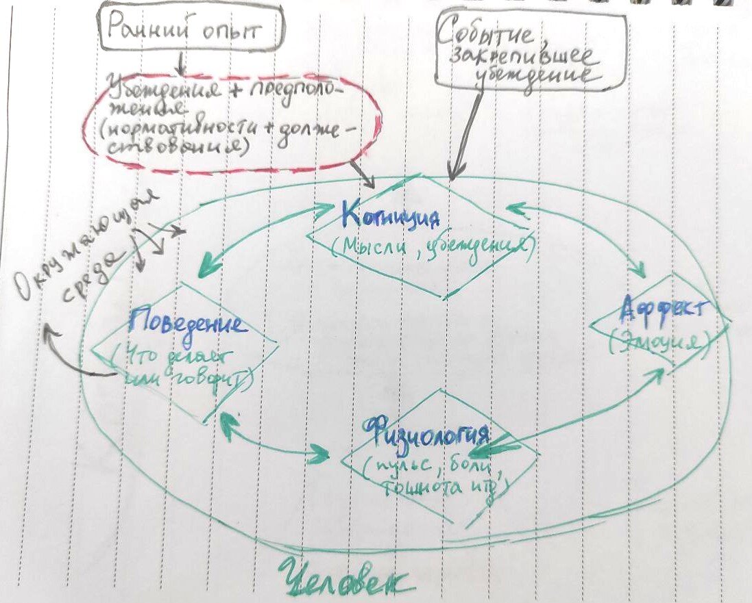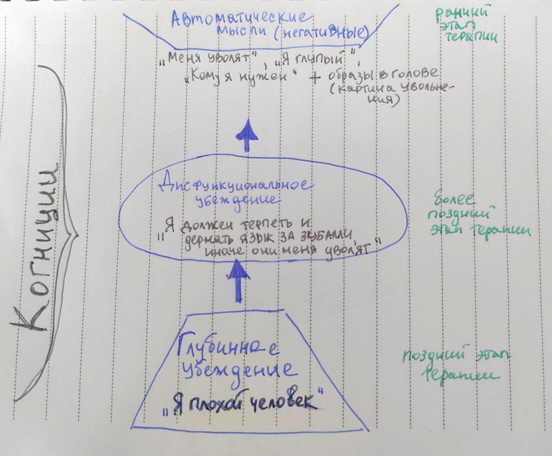 Интерпретация событий играет решающую роль. Работа с мыслями, то есть убеждениями (их я буду называть когнициями) - важнейшая часть в КПТ подходе. Представим событие: "Увольнение с работы" и разберем процесс мышления на этом примере: Событие - увольнение Эмоция - у кого-то гнев, у кого-то депрессия, у кого-то нервное, но позитивное настроение. У каждого будет своя интрепретация/ощущение (из-за разных когниций - про них позже) Мысль - "Как они могли?!" Реакция - "Плач", "Удар кулаком об стену" итд Когда эмоция избыточна - значит, интерпретация(когниция) кривая для данной ситуации. Перемены наступают при работе с интерпретациями (когнициями), а не с событиями, влияющими на наши реакции и мысли. Вы не сломались, пытаясь понять связь? держитесь...ниже будут еще схемки. В КПТ принято делить когниции на три вида: автоматические, дисфункциональные предположения и глубинные убеждения (программы). Автоматические мысли (специфичны для каждой отдельной ситуации, наиболее распознаваемы человеком с