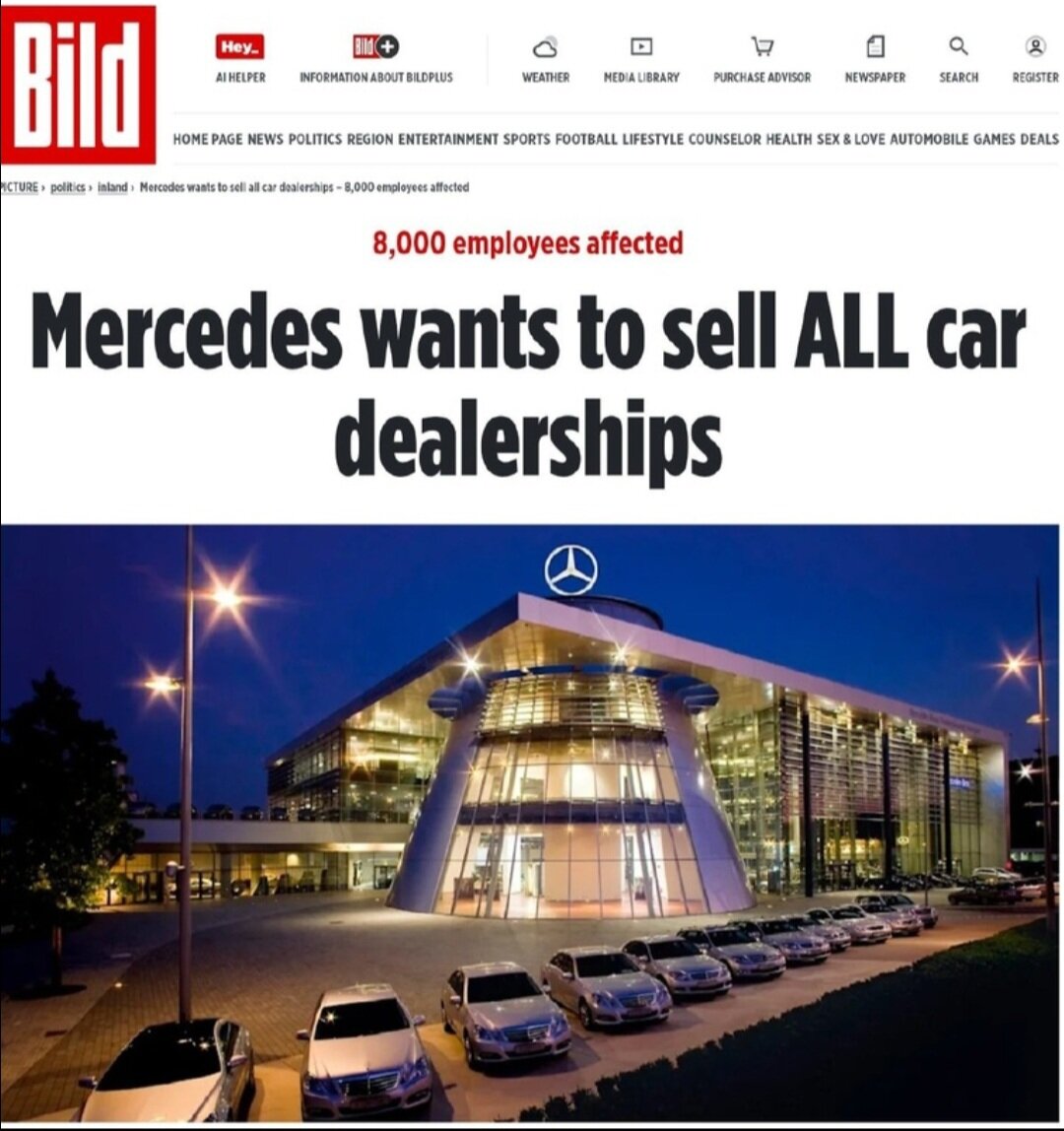 Доброе утро, Любопытные новости приехали. Мерседес закрывает все свои представительства в Германии и увольняет 8000 человек одномоментно. Теперь будут работать в Китае на совместных предприятиях с китайцами. Ну и использовать тот же дешёвый российский газ, который они отказались использовать в Германии. Мерседес не пропадёт, а вот немцы будут жить хуже. Вот так действуют евросанкции против РФ. Молодцы, что). У меня машина этой марки. Недавно отпраздновала 50тыс км (быстрее, чем я 50-летие 🙃). Думал обновить (машине уже 7 лет), но теперь оооочень сильнл буду думать, что брать. Пока покатаемся на этой). А там может и aurus машинки подешевле сделает и будет что покупать. Хорошего дня и хороших новостей, Кот Учёный