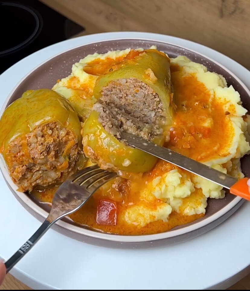6. Сверху выкладываем перцы и заливаем сметанно-томатным соусом