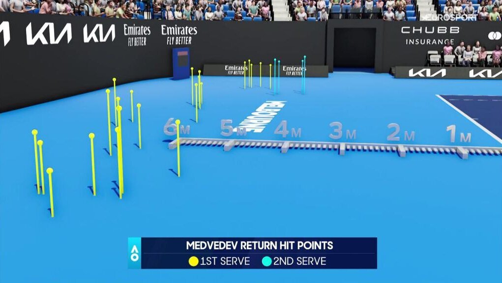 Итоги были очень интересными. В такой ситуации 43% приемов Медведева приземляются ближе к задней линии, чем к линии подачи – это третий показатель в туре. И, например, у Каспера Рууда, который тоже очень глубоко стоит на приеме, этот показатель всего 24%.