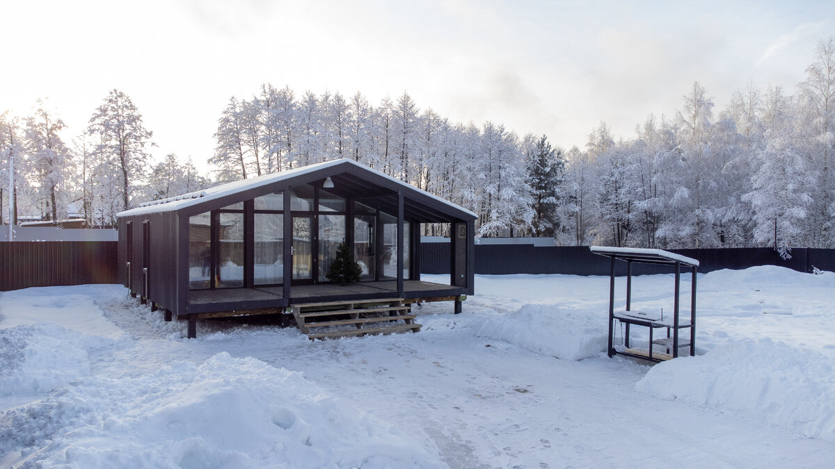 Дом на этих фотокарточках мы построили для семьи Майоровых. Это модель FL 43 м² черного цвета с панорамными окнами и террасой, с которой открывается прекрасный вид на зимний лес 😍 Такой дом прекрасно подойдет для небольшой семьи, в качестве основного жилья за городом, ведь в наших теплых домах можно жить круглый год!