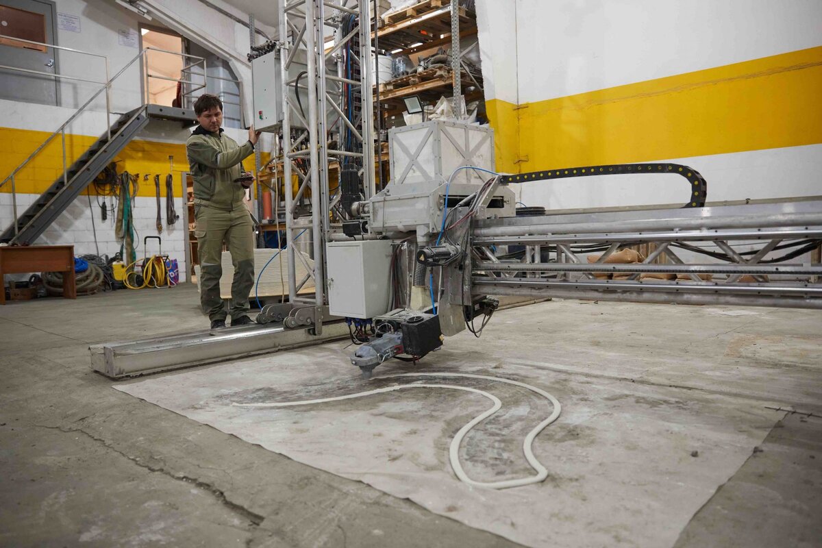Кондитерский шприц — вот что приходит на ум при виде строительного принтера, который слой за слоем выкладывает причудливые клумбы, вазоны, скамейки и другие «малые архитектурные формы». Машина занимает практически все пространство цеха и напоминает мостовой кран, какой можно встретить на любом производстве. Правда, печатающая головка движется гораздо активнее. Слоеная структура действительно придает готовым изделиям какой-то кондитерский, аппетитный вид, словно это мебель для пряничных домиков. Но откуда в цехе всполохи электросварки?