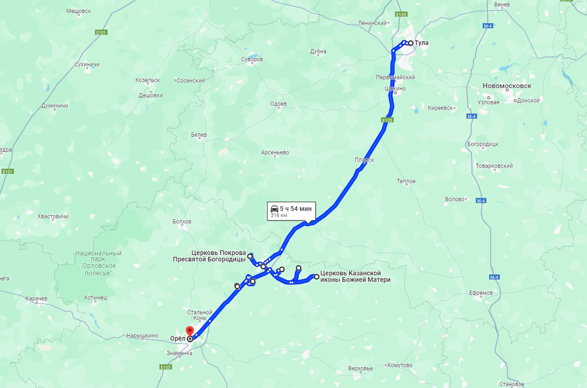 Маршрут: Тула – Глазуново - Мценск– Хальзево – Верхнее Алябьево - Кислино - Шеино - Усадьба Новосильцева - Орел