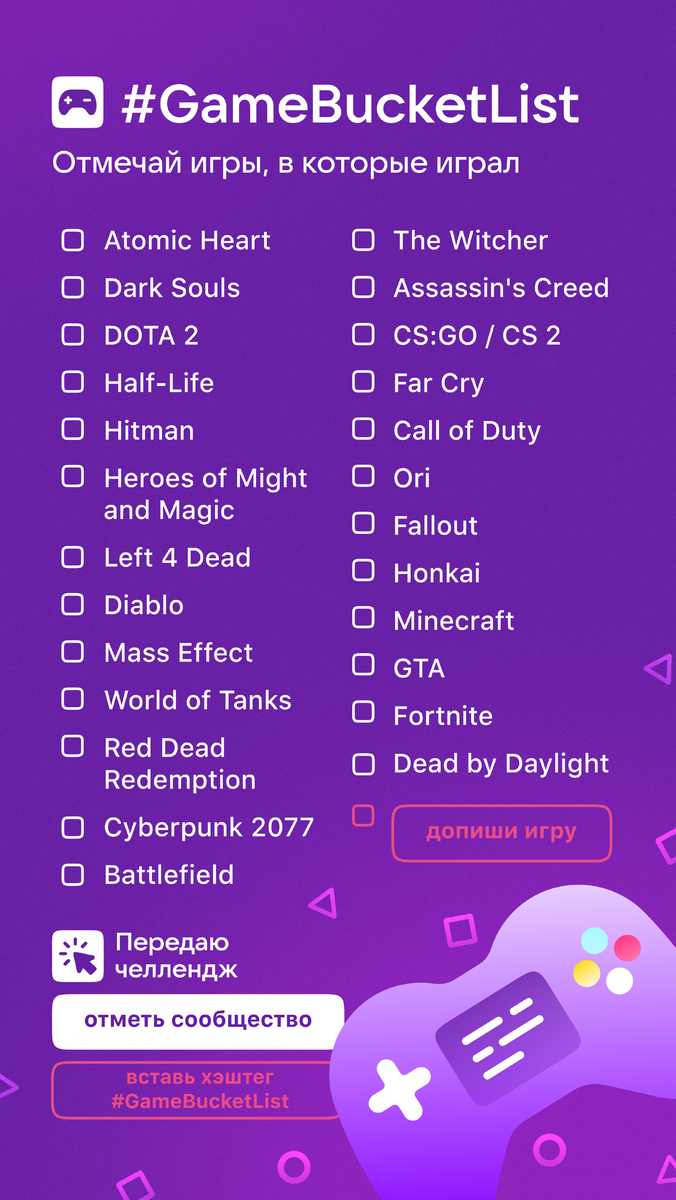 У себя в сообществе WELOVEGAMES я опубликовал свой Game Bucket List. Заходите посмотреть, если интересно. А ещё приглашаю вас поделиться своим вариантом тут в комментариях. Расскажите, во что вы играли, а во что ещё нет. #GameBucketList