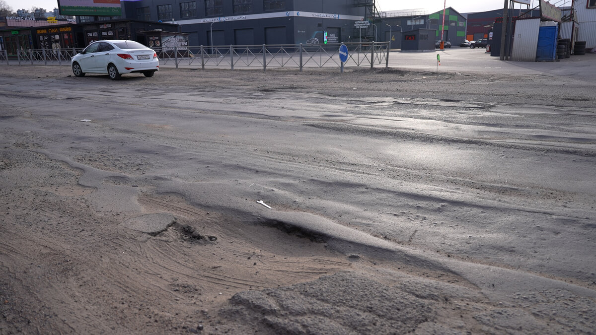 Однако ямочный ремонт, если и производится, то не спасает ситуацию. У нас не получилось даже измерить длину и ширину ям: они перетекают одна в другую, превращая целый километр дороги в одну сплошную выбоину. Местами вместо покрытия осталась только гравийная подложка.