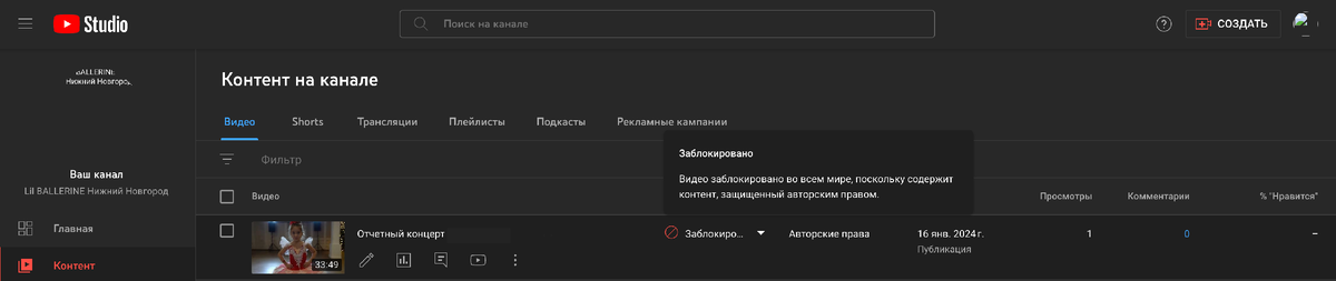 Видео было с музыкой, которая играла на концерте (со всеми шумами и криками от гостей). И после выкладки видео тут же заблокировали! Я сразу поняла, что виновата музыка в видео. Дело в том, что в видео много разных треков и я задалась вопросом, а как понять, что именно нарушило Авторское право? Показываю инструкцию как это посмотреть: 1. Заходим в YouTube Studio и наживаем на видео, которое заблокировали 2. Нажимаем на "Авторские права" в левой боковой панели. И вот тут показано, что Ютуб определил музыку (кстати не всю), и можно посмотреть какая именно нарушает авторские права: В моем случае это - The Nutcracker Suite, Op. 71A: March (feat. Alberto Lizzio). Как исправить? YouTube предлагает вырезать фрагмент, заменить трек, удалить трек, или оспорить заявку. У нас прав нет, поэтому, мы либо заменим музыку в этом фрагменте, либо вырежем. При видеомонтаже роликов на Ютуб, Инстаграм и др. стоит учитывать этот факт, что музык