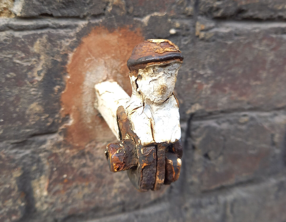 Большинство увиденных мной человеческих фигурок были уже совсем старенькими, наверняка возраст многих из них уже перевалил за целое столетие, но однажды внезапно попалась относительно новая, с которой даже не сняли ценник (на фото ниже). И действительно, как показал беглый поиск на европейских сайтах стройматериалов, такие фигурки по сей день имеются в продаже. Стоят от 10 до 70 евро в зависимости от размеров, материала, способа крепления и внешнего вида человечка. По-французски такие держатели называются Arrêt de volet, по-немецки – Fensterladenhalter, а вот по-итальянски – Fermapersiana, или персидский замок (останавливатель), что, по всей видимости, свидетельствует о подлинном происхождении этой любопытной детали. Впрочем, самому мне не удалось найти какой-либо информации о персидских корнях подобных держателей.