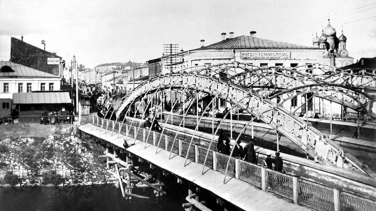Все вы слышали поговорку «стоит как чугунный мост». В Москве мост этот сохранился. Правда, при прокладке трамвайных путей он утратил часть своего убранства – были сняты ажурные чугунные арки, чтобы вагон с пантографом помещался в габарит. Идём к Чугунному мосту. Нам на Пятницкую улицу. Мост ведёт с Пятницкой на Балчуг и на Лубочный переулок. Первый мост на этом месте, деревянный, названный Высокопятницким, был выстроен в 1785 году, одновременно с прокладкой Водоотводного канала (впечатляемся нашими предками – вручную при устройстве Водоотводного канала было выбрано около 3,5 миллионов кубометров грунта. Один землекоп в день вынимает около 1,5-3 кубических метров. Канал строили с 1782 по 1789 – около 7 лет. Значит, один землекоп за 7 лет мог выкопать от пяти до восьми тысяч кубометров. А вынули за 7 лет вручную около 3,5 миллионов.) Второй мост был выполнен висячим из дерева и джута и построен в начале XIX века. Третий мост — собственно Чугунный мост — был построен в 1835 инженером П.Я.