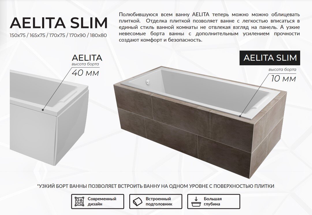 Полюбившуюся всем ванну Aelita теперь можно можно облицевать плиткой. Отделка плиткой позволяет ванне с легкостью вписаться в единый стиль ванной комнаты не отвлекая взгляд на панель. А узкие невесомые борта ванны с дополнительным усилением прочности создают комфорт и безопасность.