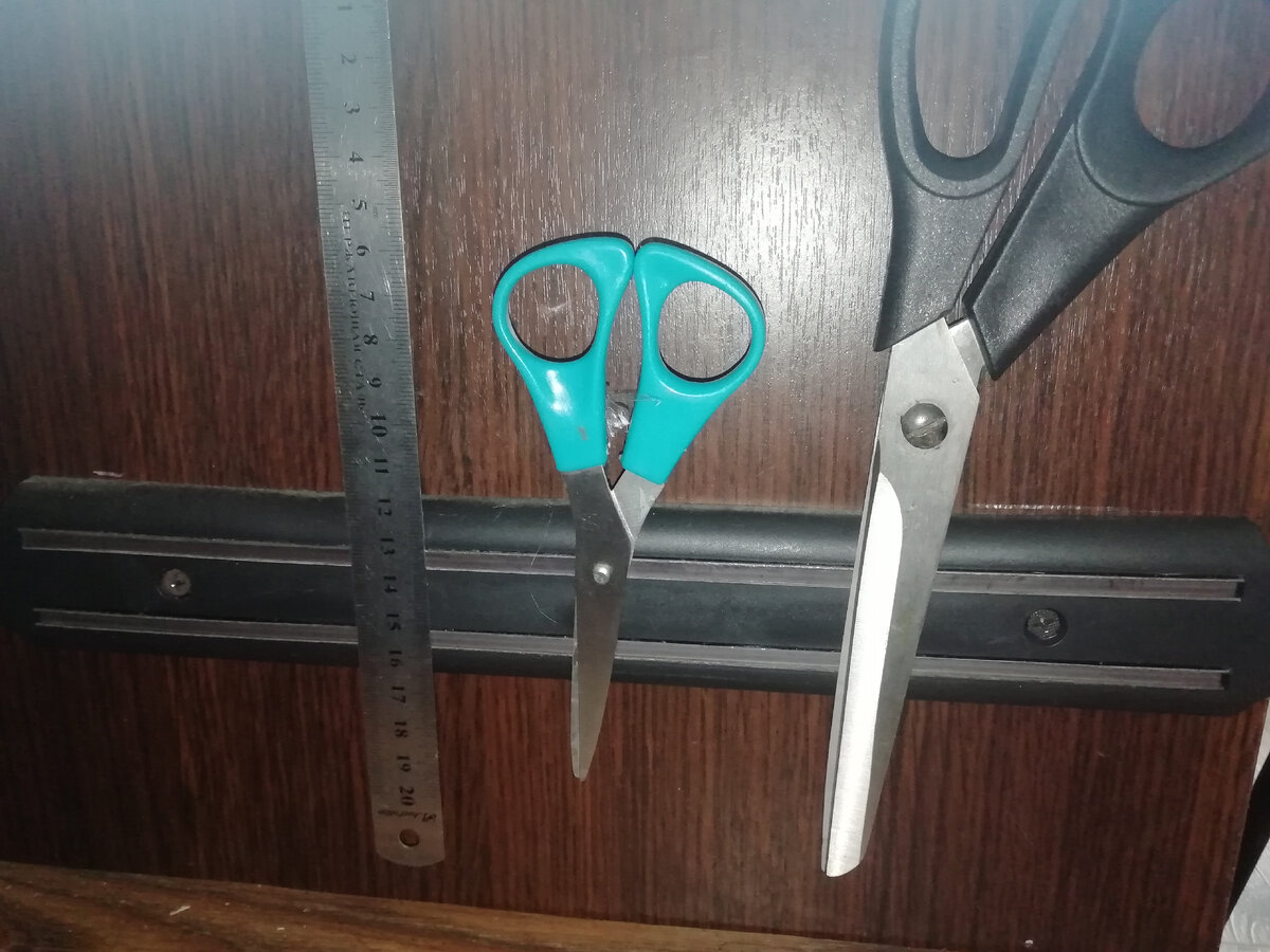 Такой магнитный держатель я купила всего за 175 рублей, он в виде ленты, которую можно закрепить саморезами. Я его прикрепила к боковой поверхности стола, чтобы ножницы были всегда под рукой во время работы.
