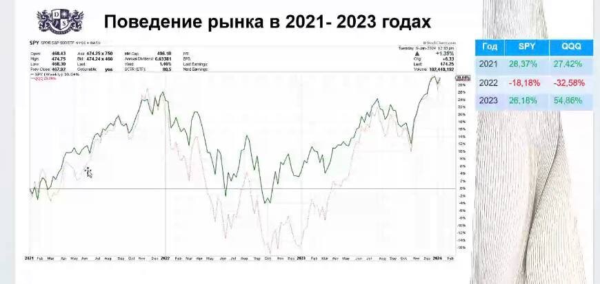 Nasdaq (QQQ) ориентировочно на 50%, причем вырос за счет топ-7 компаний (имеют большой вес в индексе, в основном за счет искусственного интеллекта), второй-третий эшелон компаний должны подтянуться.