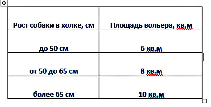 Размеры жилья зависят от породы, пола и возраста собаки. В таблице приведены минимальные параметры площади в прямой зависимости от роста вашего пса. Увеличение площади только приветствуется.