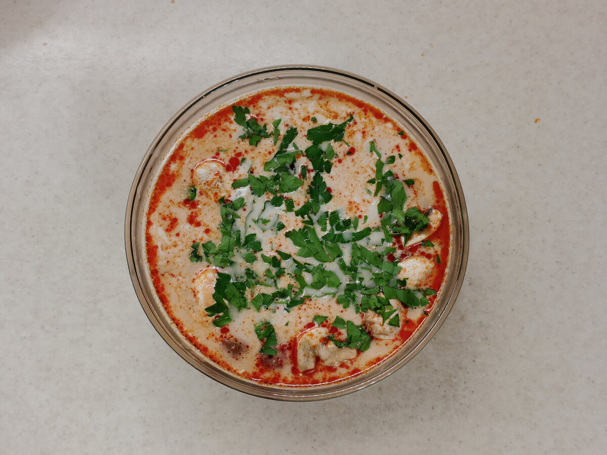 Суп готов, теперь сервируем его. Как правило Том Ям подают в глубокой миске, украсив кунжутом и зеленью - традиционно кинзой, но если вы её не любите возьмите петрушку. Также я не наливаю кокосовое молоко в суп в процессе готовки, по идее его там и не должно быть, но так уж повелось, что у нас большинство любит Том Ям именно с кокосовым молоком. Поэтому тому кто хочет можно добавить его непосредственно в тарелку, а тому кто не хочет не добавлять вовсе. А как вы считаете должно ли быть кокосовое молоко в Том Яме или нет - напишите в комментариях, будет интересно узнать ваше мнение!