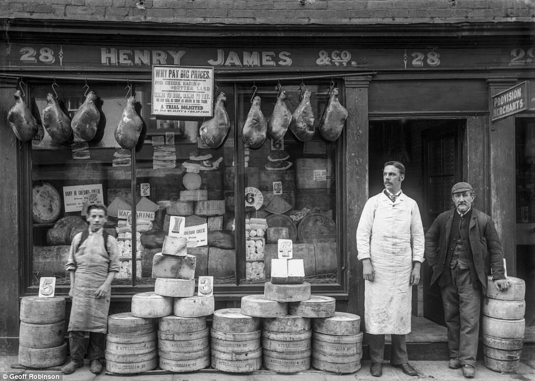 Особенно меня поразили сыры - огромные тяжелые головы, выложенные для наглядности прямо на тротуар рядом с лавкой. Конец 19 века, прогресс, а санитарные нормы пещерные.