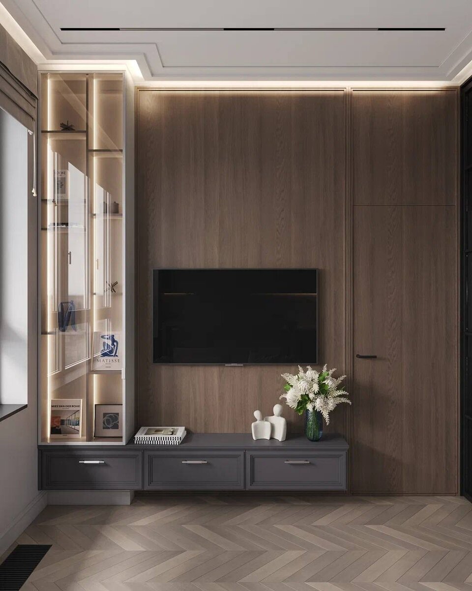 Если говорить про тренды 2024 года, в декорировании стен прослеживается уход от активных 3д панелей. Сложная навязчивая геометрия рельефных 3д панелей заменяется на природные материалы. Например шпонированные и каменные панели. Простота и лаконичность их форм делает интерьер дорогим и уютным. Также активно используются зеркала. Не только как функция, но и как декор. И это прекрасный прием, так как они добавляют свет, воздух и увеличивают пространство
