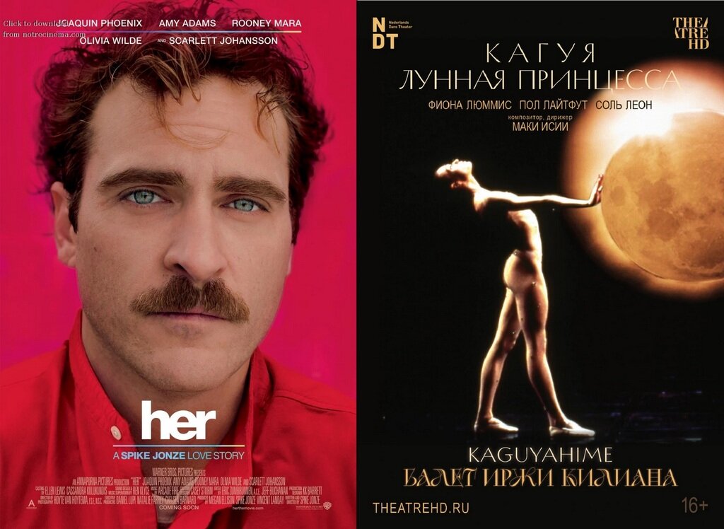 Сегодня видеоальбом сайта https://afisha7.ru пополнился трейлерами фильмов «Она», «Иржи Килиан: Кагуя — лунная принцесса». «Она» Трейлер фильма «Она» производства США. Фильм о том, как Хоакин Феникс полюбил голос Скарлетт Йоханссон. Теодор — одинокий писатель, покупает новую техническую разработку — оперативную систему, призванную исполнять любое желание пользователя. К удивлению Теодора, вскоре между ним и виртуальной героиней возникает роман. Фильм 2013 года. «Иржи Килиан: Кагуя — лунная принцесса» Трейлер музыкального фильма «Иржи Килиан: Кагуя — лунная принцесса» производства Нидерландов. Философская японская сказка о недостижимой мечте — в танце под бой барабанов. Спектакль классика современного танца Иржи Килиана, поставленный по мотивам японской сказки о Лунной принцессе (Кагуя-химэ), родился и живет на стыке цивилизаций и миров, в переплетении древних ритуалов и современности, в балансе между медитацией и мощным драйвом. Неземная девушка похожа на холодный драгоценный камень, ч